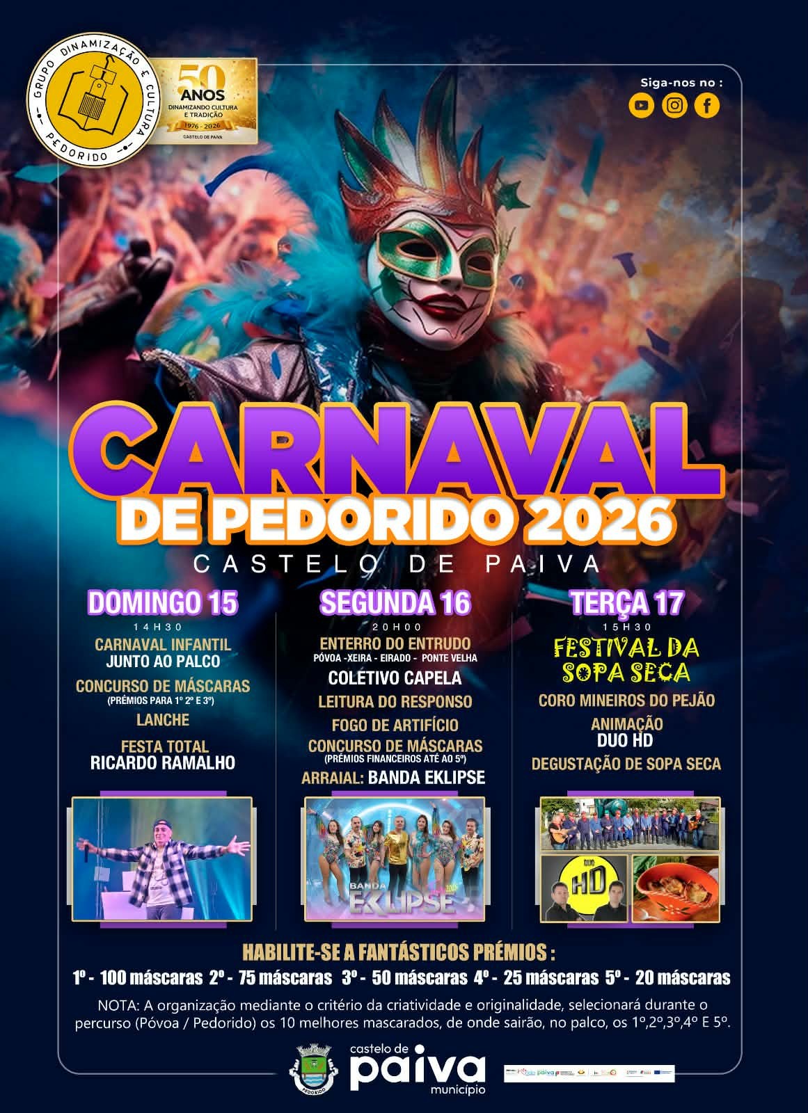 Na manhã da próxima Sexta-feira, dia 13 de Fevereiro, vão decorrer os Desfiles dos Agrupamentos Escolares, sendo que, no Largo do Conde, vão desfilar os alunos do Agrupamento Escolas de Castelo de Paiva, do Centro Social e Paroquial de Sobrado e da APPACDM de Castelo de Paiva, e pelas ruas de Oliveira do Arda, na Raiva, vão desfilar os alunos do Agrupamento Escolas do Couto Mineiro e o Centro Social do Couto Mineiro, enquanto para a tarde do mesmo dia, está marcada a apresentação do Carnaval Sénior, com a participação das IPSS do concelho, uma iniciativa muito acarinhada pela população e agendada para Largo do Conde ou para o espaço da sede do Rancho Folclórico de S. Martinho, caso haja condições climatéricas adversas.