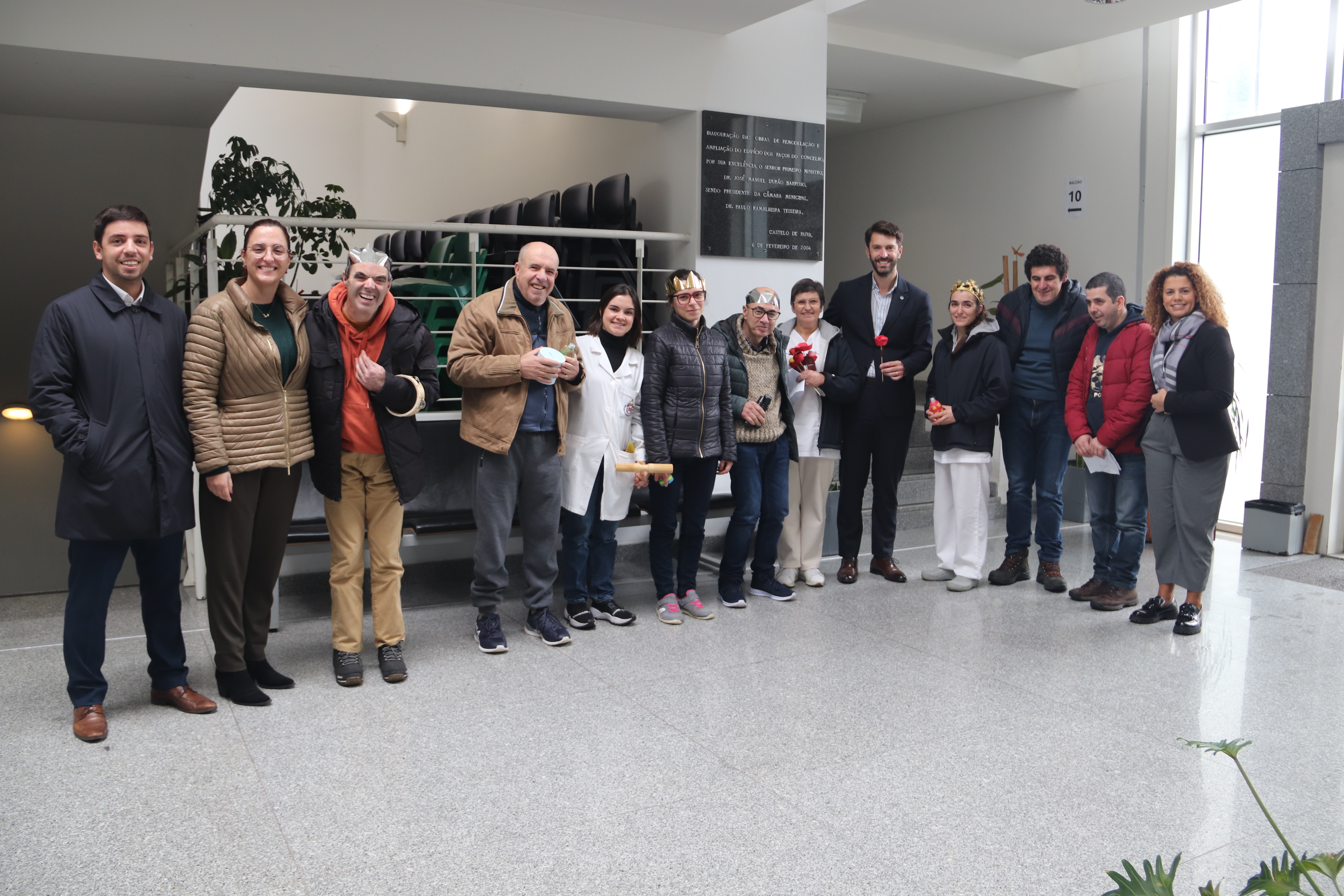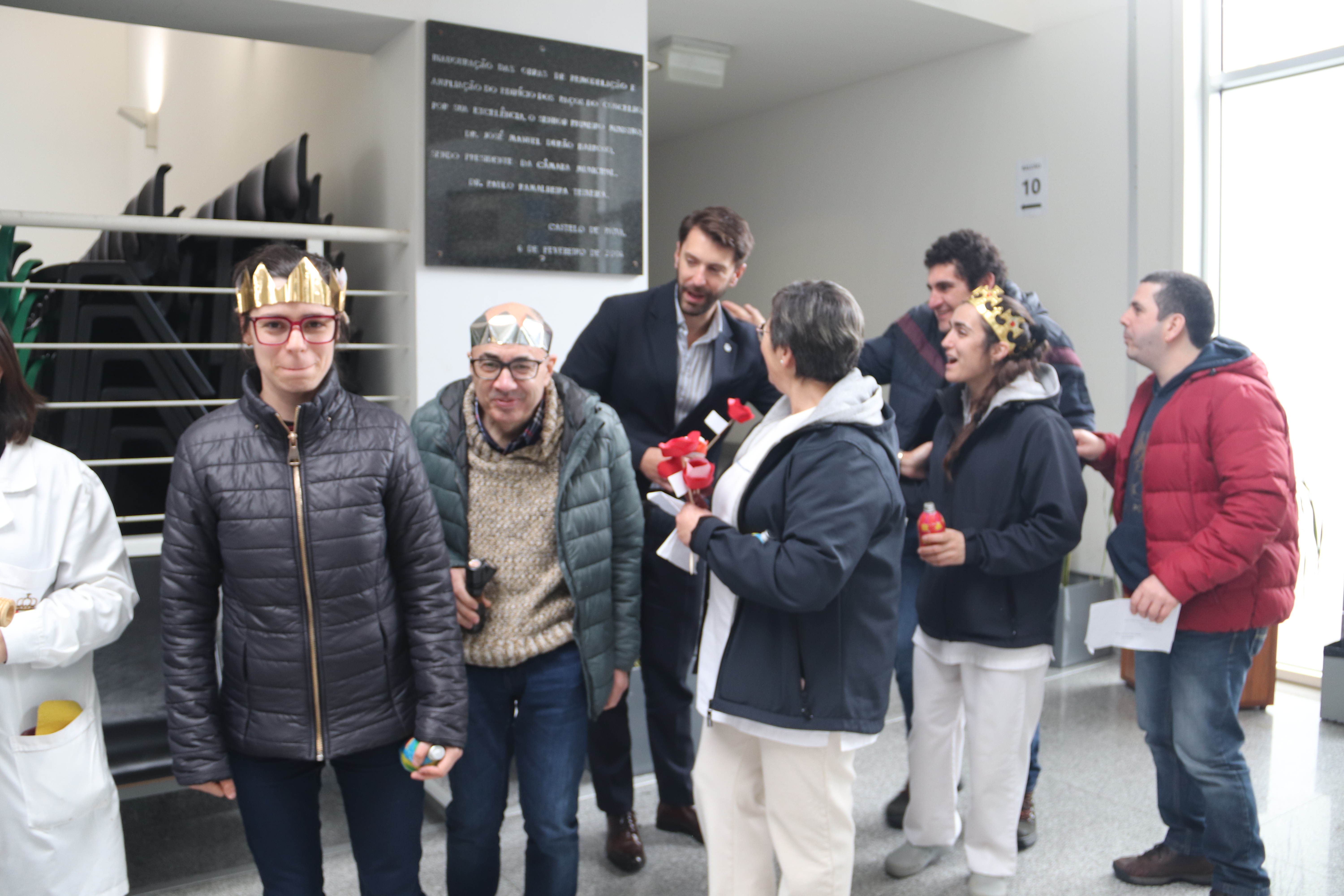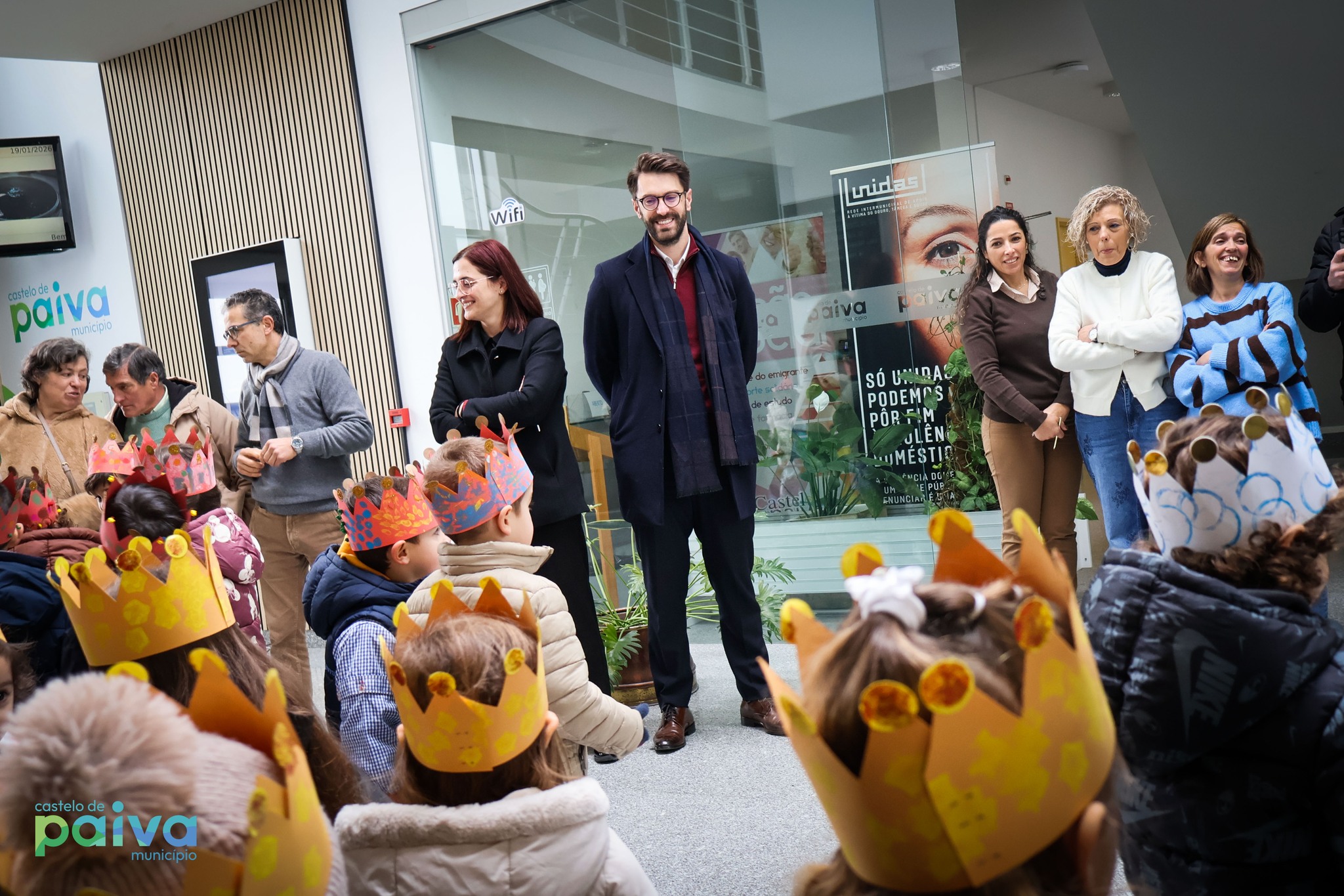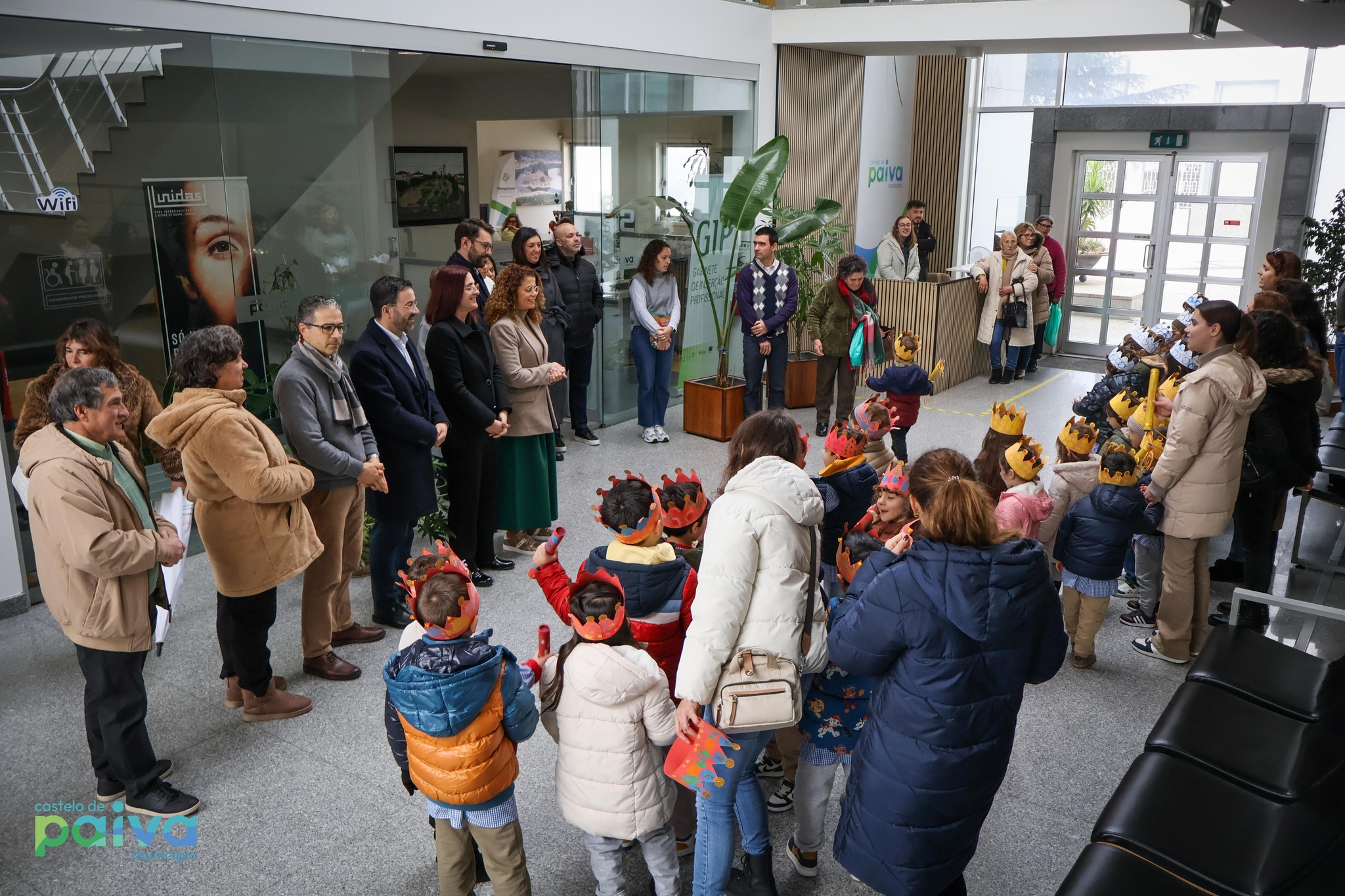 De coroa na cabeça, as crianças do Centro Social Paroquial de Sobrado foram ontem recebidas pelo presidente da Câmara Municipal, Ricardo Cardoso, e pelos restantes elementos do Executivo Municipal, no edifício dos Paços do Concelho, para cantar as Janeiras.
