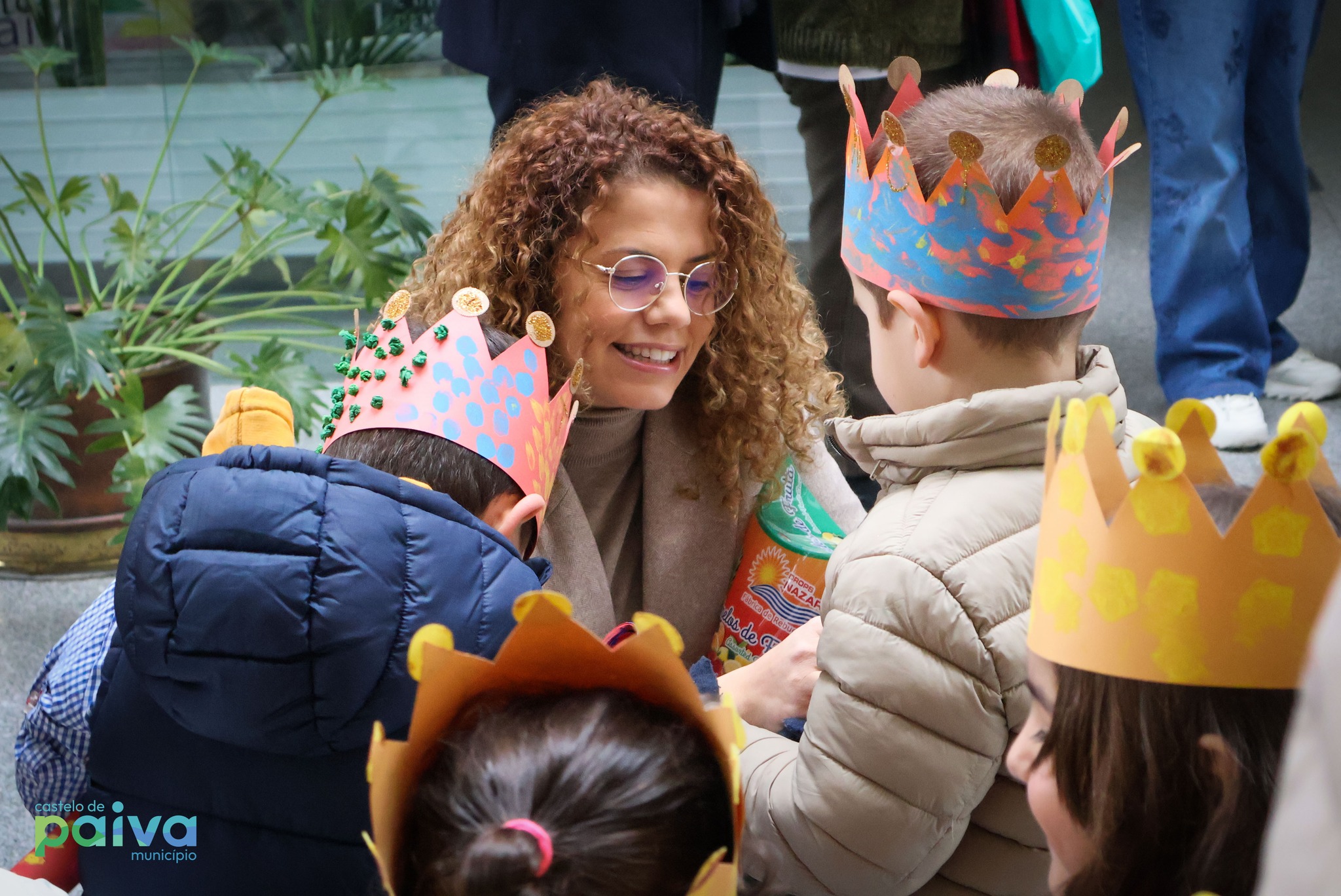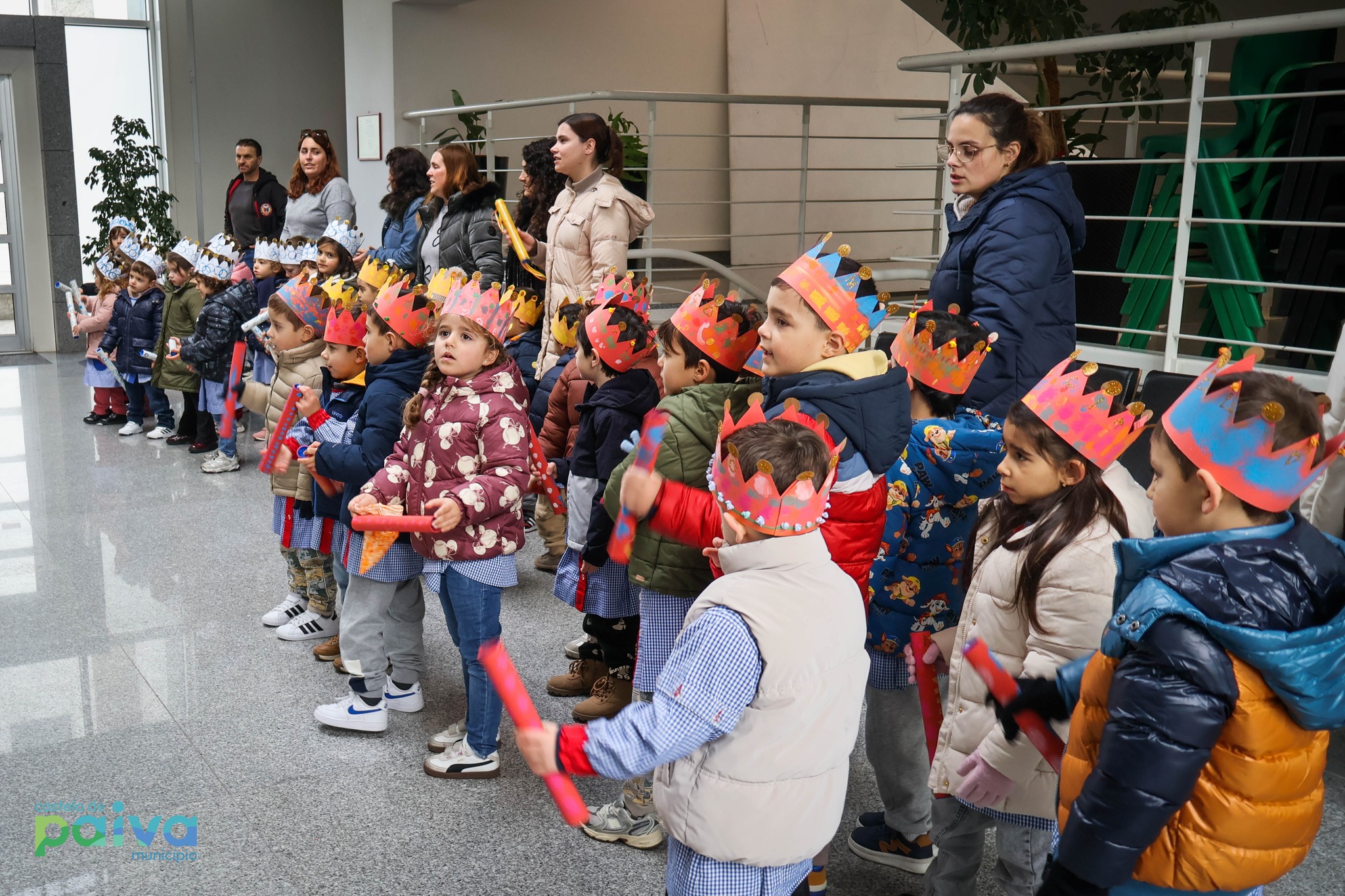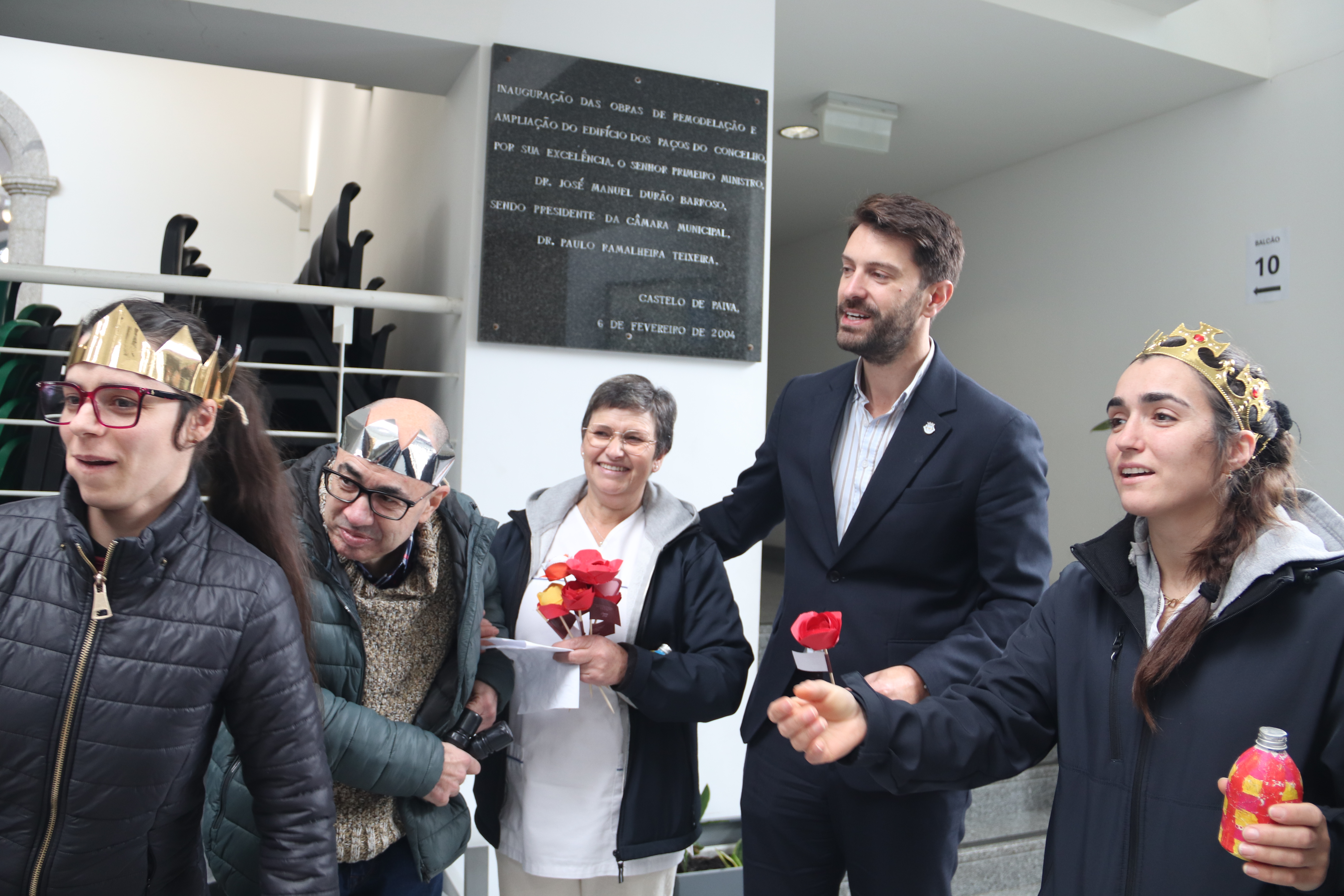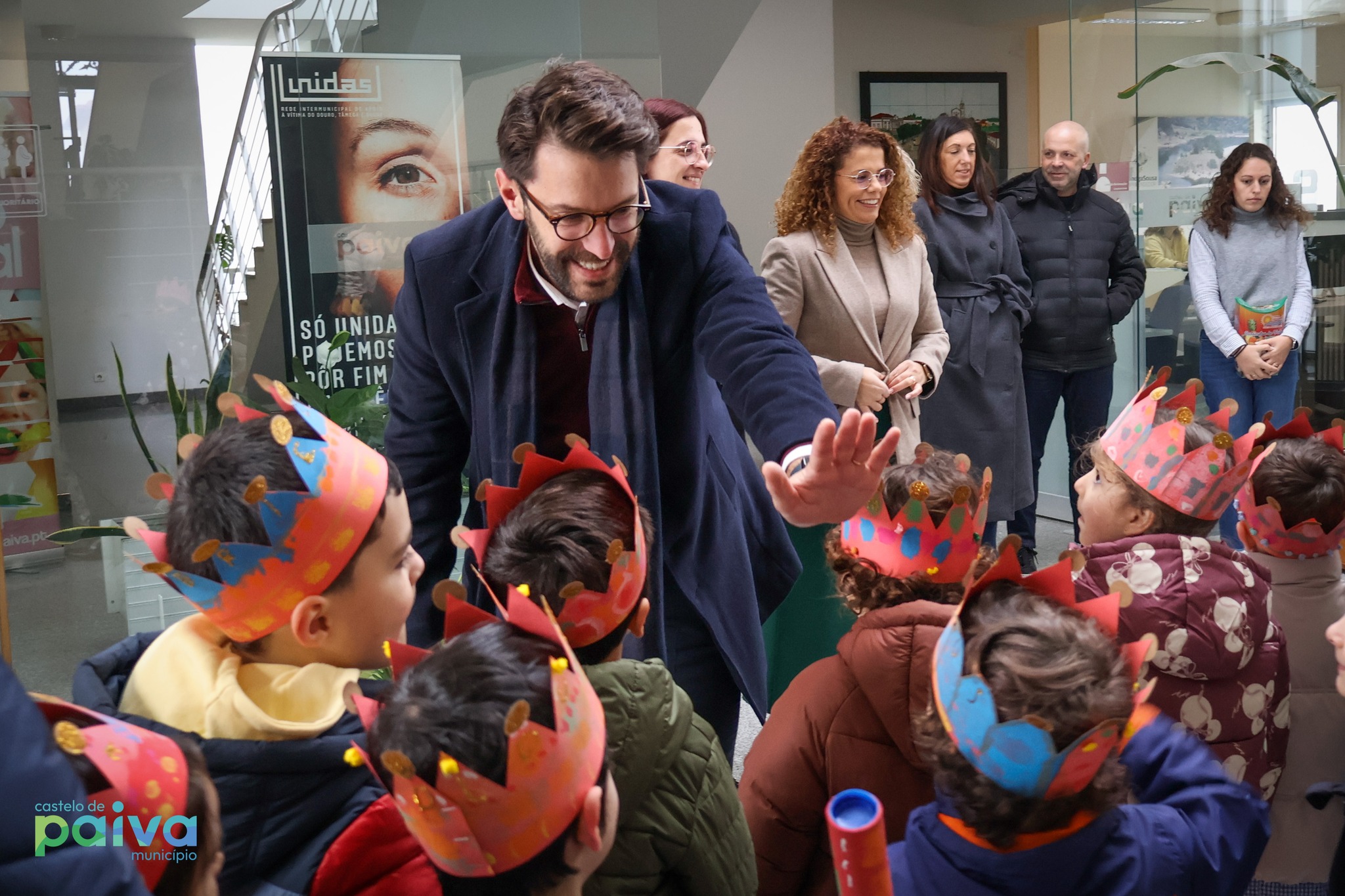 De coroa na cabeça, as crianças do Centro Social Paroquial de Sobrado foram ontem recebidas pelo presidente da Câmara Municipal, Ricardo Cardoso, e pelos restantes elementos do Executivo Municipal, no edifício dos Paços do Concelho, para cantar as Janeiras.