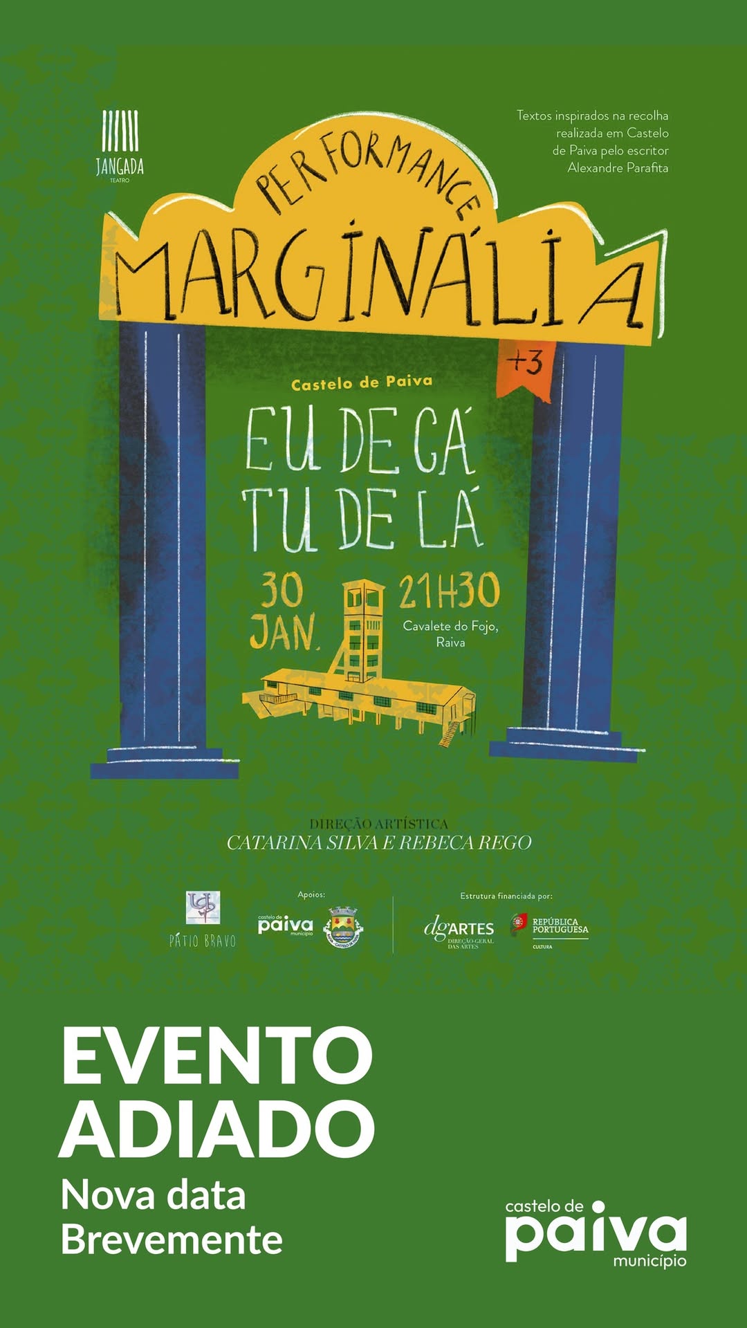O espectáculo "Eu de cá, tu de lá", da Jangada Teatro, agendado para hoje à noite, dia 30, no espaço do Cavalete do Fôjo, na freguesia da Raiva, foi adiado devido às condições climatéricas adversas.