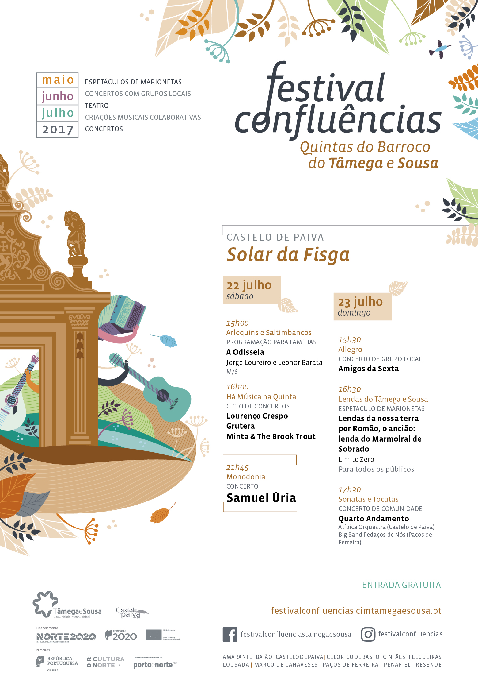 Castelo de Paiva vai receber no próximo fim de semana, 22 e 23 de Julho, a ultima jornada do "Festival Confluências - Quintas do Barroco Tâmega e Sousa", que terá lugar no espaço do Solar da Fisga, em Bairros, sendo que, dos vários espectáculos agendados para esta derradeira jornada, ressalta a actuação de Samuel Úria na noite de sábado, conceituado músico português, membro do movimento Flor Caveira fundado por Tiago Guillul, sendo líder dos Samuel Úria & As Velhas Glórias, embora se tenha celebrizado nos últimos anos pelos seus trabalhos a solo.