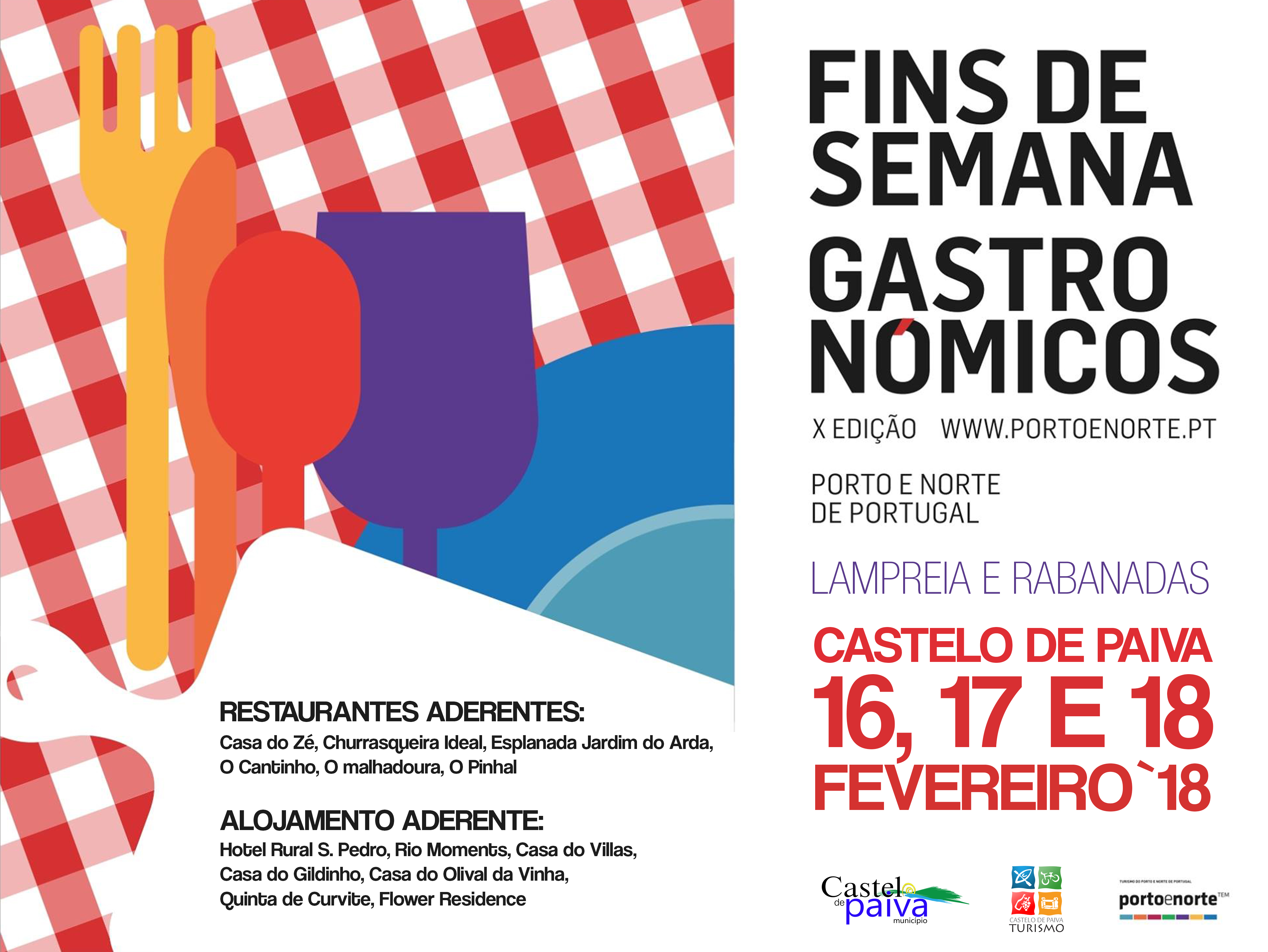 Pelo décimo ano consecutivo, o município de Castelo de Paiva associou-se à Entidade Regional do Turismo do Porto e Norte de Portugal e vai reeditar entre 16 e 18 de Fevereiro, mais um fim-de-semana gastronómico, voltando este ano a ser dedicado a um dos pratos mais tradicionais e característicos desta região: o Arroz de Lampreia e como sobremesa, as saborosas Rabanadas à moda de Paiva, apetecíveis iguarias que vão estar em destaque nos seis restaurantes aderentes à iniciativa.